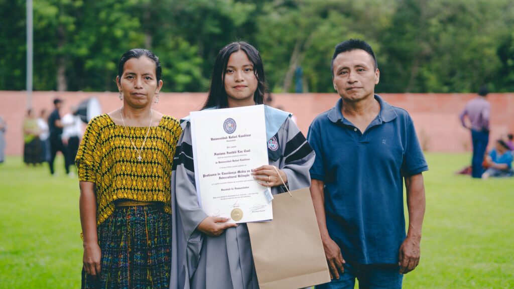 Armando, exalumno de IMaCK, quien aparece junto a sus padres, también se graduó de la Universidad Rafael Landívar. Él también será el primero de su familia en graduarse de una universidad. Su historia es única, ya que ha pasado de estudiante a mentor y luego a profesor en IMaCK, donde ahora continúa su compromiso con la educación de su comunidad.