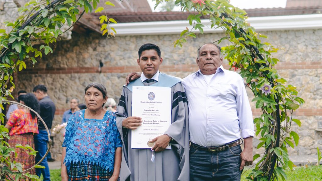 IMaCK alumnus, Armando, featured with his parents, also graduated from the Universidad Rafael Landivar. He too, will be the first in his family to graduate from a university. His story is unique because he has gone from student to mentor to teacher at IMaCK, where he now continues his commitment to the education of others in his community.
